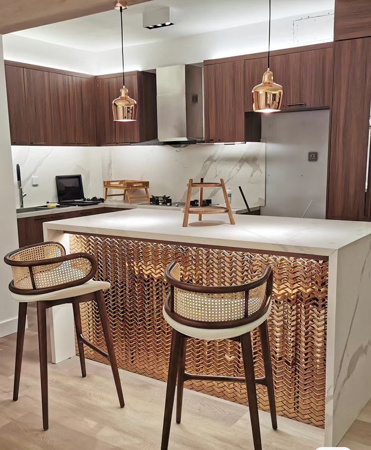 In residential settings, copper mosaics can transform a simple background wall into a statement piece. Whether it's the wall behind the sofa in the living room or the one in the bedroom, copper mosaics add a touch of luxury and warmth.